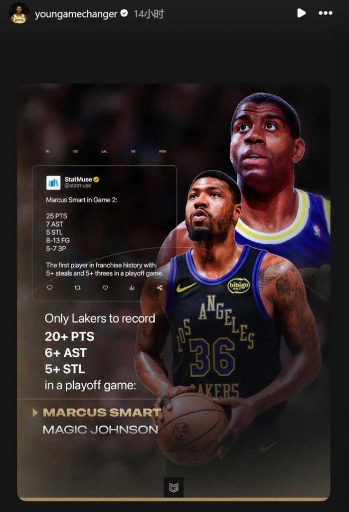 同时,斯玛特季后赛单场至少20分6助攻5抢断,湖人队史第二人,比肩魔术师。